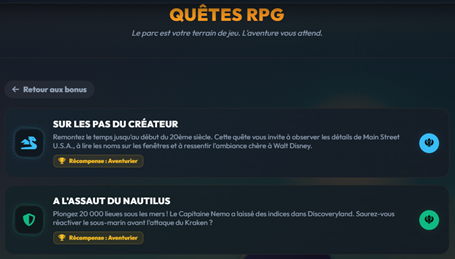 Transformez votre visite au parc en un véritable jeu de rôle grandeur nature ! Le Mode Quêtes vous lance des défis amusants à réaliser directement dans le parc (trouver un objet caché, prendre une photo spécifique, répondre à une énigme...). C'est le moyen parfait pour pimenter votre journée, découvrir des détails insoupçonnés que la plupart des visiteurs ratent, et occuper vos enfants dans les files d'attente !