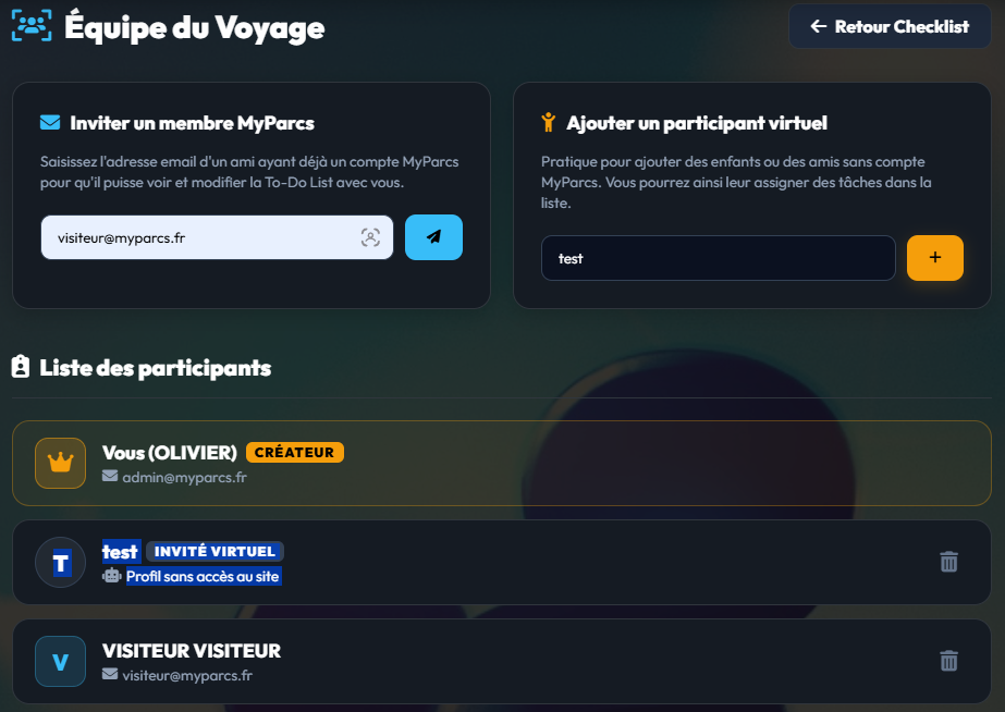 Vous voyagez avec des enfants ou des personnes qui ne souhaitent pas créer de compte ? Utilisez le bloc orange de droite "Ajouter un participant virtuel". Indiquez simplement leur prénom (ex: Léo ou Emma) et validez. Ils n'auront pas d'accès au site, mais leurs noms apparaîtront dans la Checklist de Voyage, ce qui vous permettra de leur assigner des tâches spécifiques !