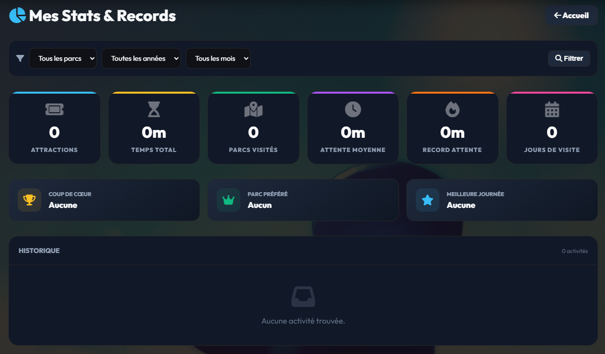 La page Historique est votre mémoire numérique au sein du parc. Elle recense chronologiquement tous les "Check-ins" que vous avez validés, que ce soit pour une attraction, un spectacle ou une simple visite de parc. C'est l'outil idéal pour répondre à la question : "Qu'est-ce qu'on a fait et à quelle heure ?".