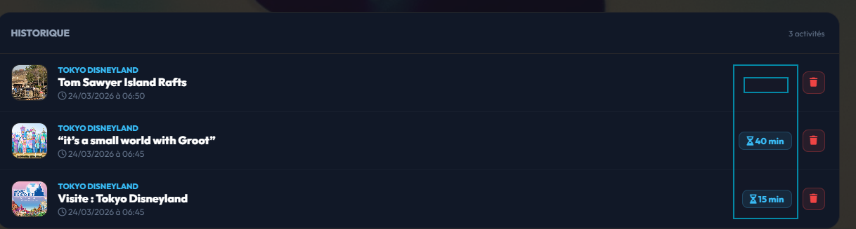 - Badge Vert (Check) : S'affiche si vous avez marqué l'attraction comme effectuée "sans attente".
