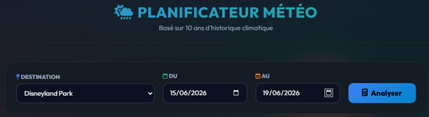 La météo est le facteur numéro un de la réussite d'un séjour dans un parc d'attractions ! Mais comment savoir quel temps il fera si vous réservez vos billets 6 mois à l'avance ? Le Planificateur Météo ne lit pas dans une boule de cristal : notre algorithme compile et analyse 10 ans d'archives météorologiques de la destination choisie pour vous donner une tendance statistique ultra-fiable de ce qui vous attend.