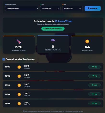 - Le Verdict Global : Un algorithme intelligent résume la tendance de votre séjour en un seul mot (Idéal, Mitigé, Humide...).