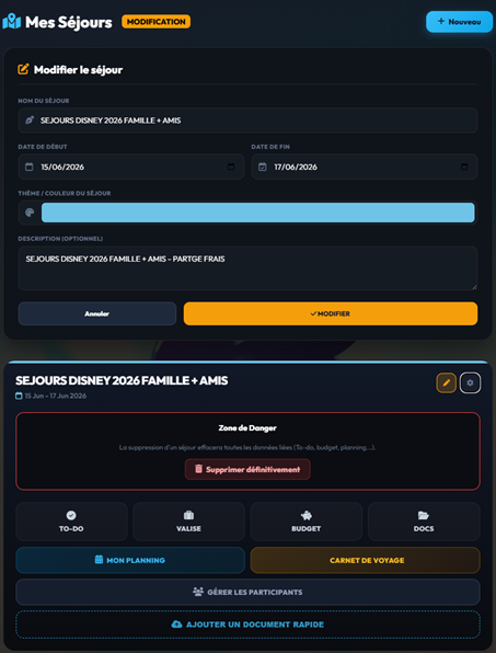 Pour commencer, cliquez sur le bouton bleu + Nouveau en haut de la page. Un formulaire apparaît : donnez un nom épique à votre voyage (ex: Halloween à Disneyland), choisissez vos dates de départ et de retour, et définissez une Couleur thématique ! Cette couleur teintera toute l'interface de votre séjour pour un rendu magnifique. Cliquez sur "Enregistrer".