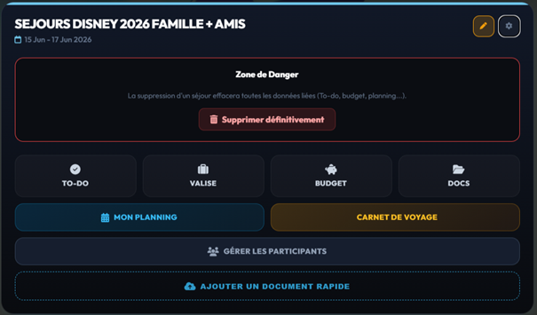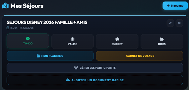 Une fois créé, votre séjour apparaît sous forme de "Carte". Cette carte est votre portail d'accès rapide. À l'intérieur, vous trouverez une grille de boutons vous permettant d'accéder aux outils liés uniquement à ce voyage :