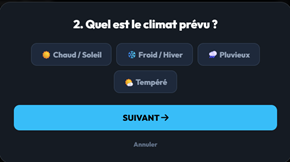- Le climat prévu (Chaud, Froid, Pluvieux...).