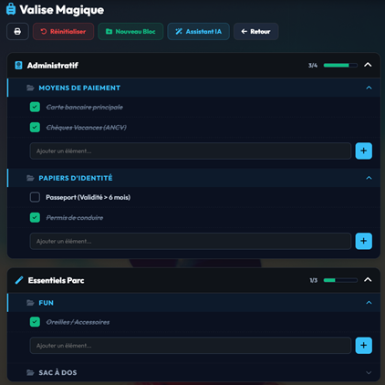 L'IA a fait 90% du travail, mais vous avez besoin d'ajouter un doudou spécifique ou des médicaments personnels ? Rien de plus simple : allez dans la catégorie de votre choix et utilisez la barre de saisie "Ajouter un élément..." située en bas de liste. Vous souhaitez créer une toute nouvelle grande catégorie (ex: "Cadeaux à ramener") ? Cliquez sur le bouton vert Nouveau Bloc tout en haut de la page.