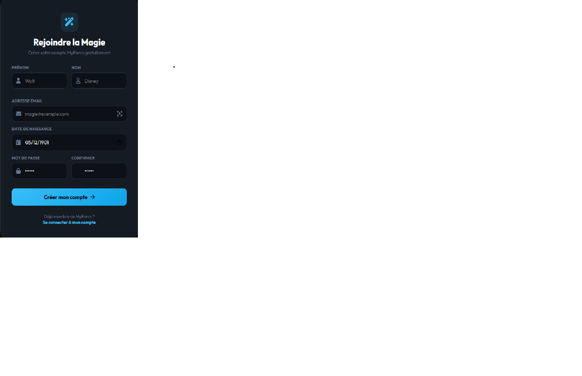 La page d'inscription est la porte d'entrée pour tous les futurs explorateurs de MyParcs. Elle permet de créer un profil personnel sécurisé en quelques secondes. Une fois inscrit, le système vous attribue automatiquement un grade de "Visiteur" et vous permet de commencer à planifier vos séjours, de gérer votre profil et de débloquer vos premiers trophées.