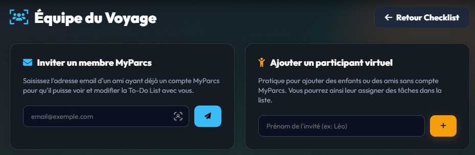 Vous voyagez avec des enfants ou des personnes qui ne souhaitent pas créer de compte ? Utilisez le bloc orange de droite "Ajouter un participant virtuel". Indiquez simplement leur prénom (ex: Léo ou Emma) et validez. Ils n'auront pas d'accès au site, mais leurs noms apparaîtront dans la Checklist de Voyage, ce qui vous permettra de leur assigner des tâches spécifiques !