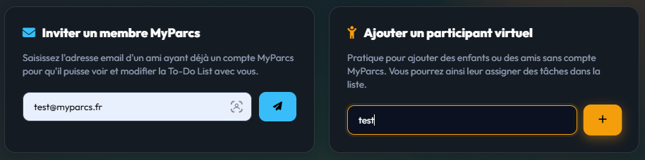 Votre conjoint(e) ou vos amis ont déjà créé un compte sur MyParcs ? Parfait ! Dans le bloc bleu de gauche "Inviter un membre MyParcs", saisissez simplement l'adresse email associée à leur compte, puis cliquez sur le bouton d'envoi. Ils seront instantanément ajoutés à votre séjour et auront accès aux outils partagés !