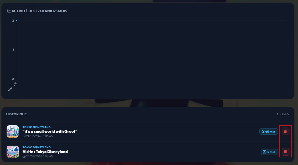 La page Historique est votre mémoire numérique au sein du parc. Elle recense chronologiquement tous les "Check-ins" que vous avez validés, que ce soit pour une attraction, un spectacle ou une simple visite de parc. C'est l'outil idéal pour répondre à la question : "Qu'est-ce qu'on a fait et à quelle heure ?".