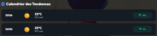 Vous voulez savoir exactement quel jour risque d'être pluvieux pour y planifier vos spectacles en intérieur ? Descendez plus bas sur la page pour voir le Calendrier des Tendances. Pour chaque journée de votre séjour, vous y trouverez une carte détaillée avec l'icône météo prévue, les températures (jour/nuit) et surtout un indicateur très visuel du Risque de pluie (en vert si le risque est faible, en orange ou rouge s'il est élevé).