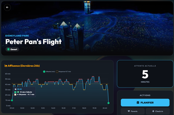 - Le Graphique d'Affluence : Observez les pics et les creux de la journée. Les points sont colorés (Vert, Orange, Rouge) selon l'intensité de l'attente. La ligne pointillée jaune représente l'attente moyenne : si le point bleu est en dessous, c'est le moment de foncer !