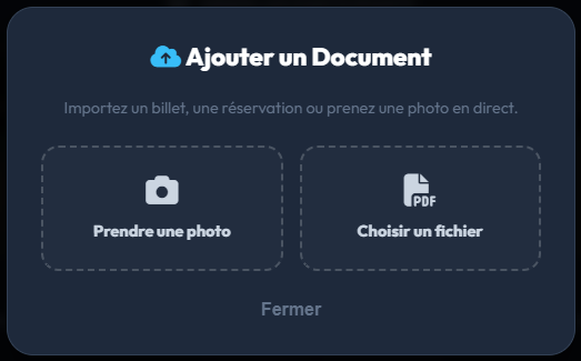 Vous venez d'imprimer vos billets de train ou votre réservation d'hôtel ? Ne les perdez pas ! Sur la carte de votre séjour, cliquez sur le grand bouton Ajouter un document rapide. Une fenêtre s'ouvre : sur mobile, vous pouvez directement cliquer sur "Prendre une photo" pour scanner votre document physique, ou choisir un fichier PDF/Image depuis votre appareil. Il sera automatiquement sauvegardé en sécurité dans le dossier du séjour !