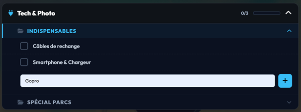 - Barres de progression : Visualisez en un clin d'œil votre état d'avancement catégorie par catégorie (Vêtements, Tech, Santé...).